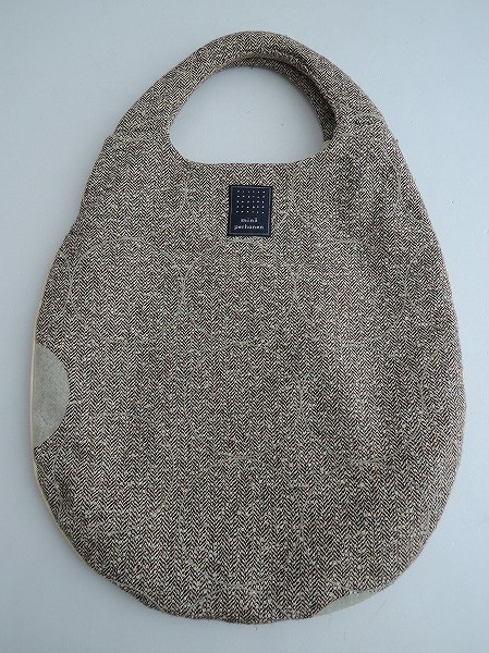 デザイン:mina perhonen 「circle」のエッグバッグです。パステル系カラーのネップ入りのチャコールブラウン×アイボリーのヘリンボーン地に、オフホワイトのフロッキープリントがあしらわれております。サイド周りはアイボリーの合皮のパイピングが施されており、裏地はオフホワイトで、素材は毛43%(アンゴラ16%)、ナイロン29%、ナイロン29%、綿28%、裏地がポリエステル100%、パイピングが人工皮革です。