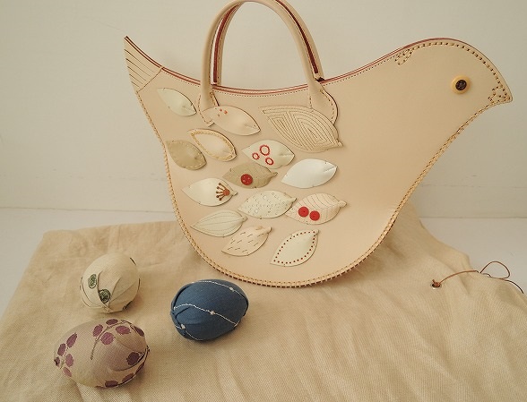デザイン:minaのtori bag とりバッグです。カラーはライトベージュで、フロントには同系色のレザーのリーフモチーフがあしらわれたデザインです。レッドの刺繍やレザーボタン等が飾られており、落ち着いた色合いのテキスタイルが使用された卵が3つ附属されています。保存袋付きです。