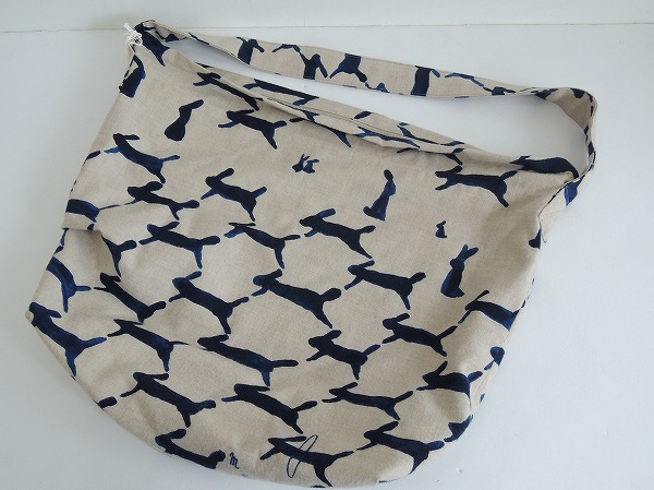 デザイン:mina perhonen 「run run run」のボディバッグ大です。カラーはグレーベージュ地にネイビーでうさぎさんが全面にプリントされた生地であしらわれております。開口部はファスナー仕様になっており、裏地はネイビーの別地に切り替えられ、内ポケットが1つ付いています。素材は表生地が毛100%、裏生地が綿100%で、定価21000円の商品です。