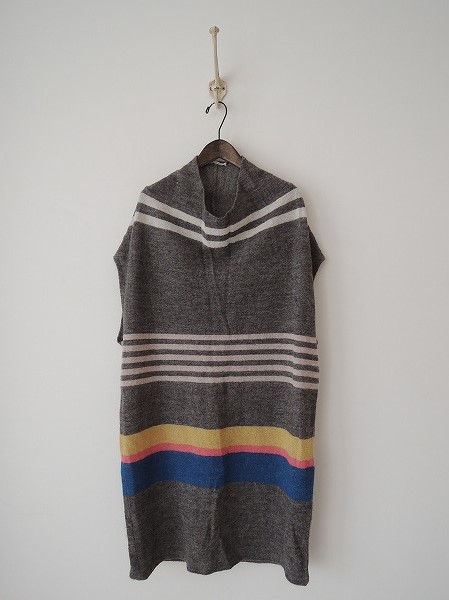 デザイン:mina perhonen 「float」のマフラー付きニットワンピースです。カラーはグレー×オフホワイト×ライトピンク×ライトイエロー×ピンク×ブルーで、マルチボーダー編みの柔らかな手触りの薄手ニットであしらわれております。付属で共布のマフラーが付いております。