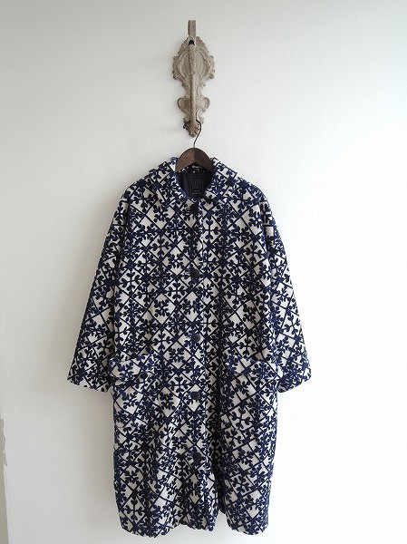 デザイン:mina perhonen「kaleidoscope」のコートです。カラーはライトベージュベースに、ネイビーのパイル地の総柄です。フロントボタンで、両腰にはポケットがあり、裏地付きです。