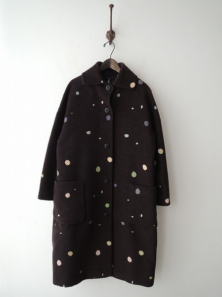 デザイン:mina perhonen 「luster」のコートです。カラーはこげ茶で、ベージュ・緑・水色・紫・黄・ピンクなどのドット柄刺繍が施されております。フロントボタン開閉で、両腰にポケットがございます。裏地付きで、定価126,000円です。
