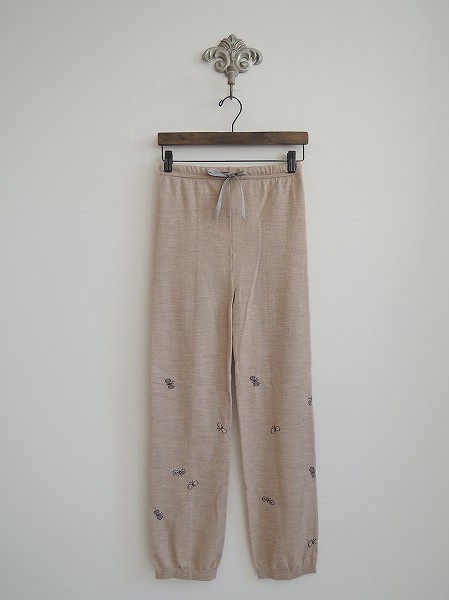 デザイン:mina perhonen「choucho」のニットレギンスです。カラーはベージュで、蝶の模様が施されたニット素材であしらわれております。ウエストゴム&ひもが通っております。