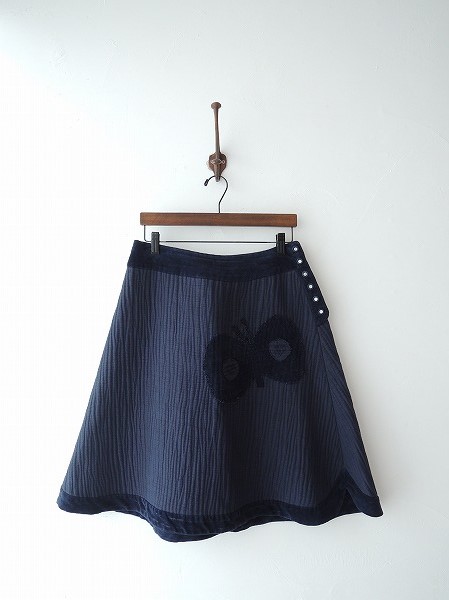 デザイン:mina perhonen 「elephant」の綿麻スカートです。カラーはネイビーで、しわ加工素材と起毛のベルベット素材であしらわれており、左サイドのボタン開きです。