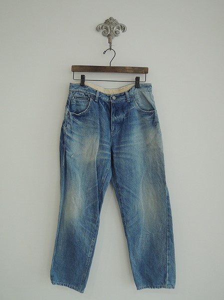 デザイン:mina perhonen 「always」のデニムパンツです。カラーはユーズド加工が施されたインディゴライトブルーで、5ポケットです。所々にダメージ加工が施されています。