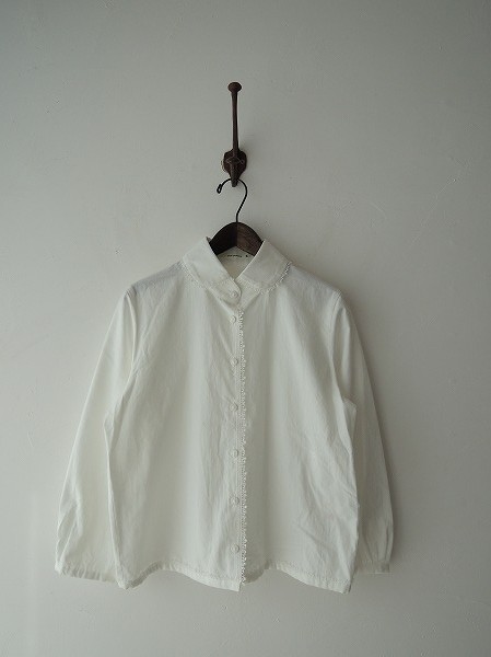 デザイン:mina perhonen 「fog night」のブラウスです。カラーはオフホワイトで、薄手生地であしらわれており、衿・前立て・裾は同色の花刺繍のレースが施されております。袖丈は九分くらいのデザインになっております。
