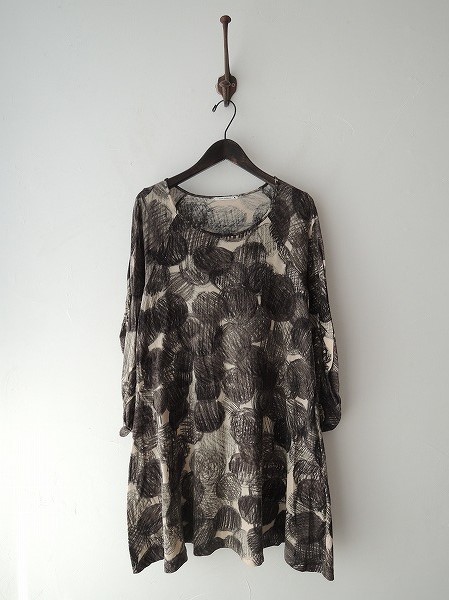 デザイン:mina perhonen 「shadow snow」のチュニックワンピースです。ライトベージュベースにブラック&ブラウンカーキ系のプリント入りのアンゴラ混の薄手生地であしらわれております。肘下から袖上部にギャザーが施されており、Aラインシルエットになっております。