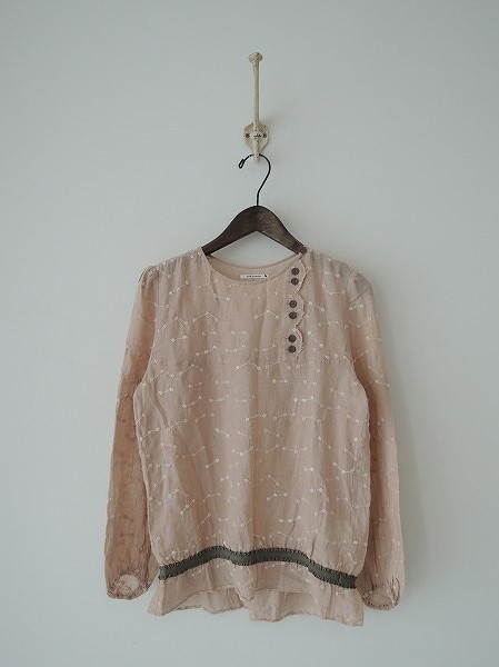 デザイン:mina perhonen 「baby snow」のブラウスです。カラーはピンクベージュで、フロント左寄りボタンです。全体に白、ピンクで刺繍があしらわれています。裾上のリボンの下、袖口はゴム入りです。