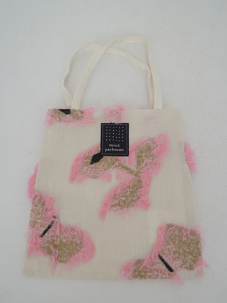 デザイン:mina perhonen 「garden」のミニバッグです。少しくすみがかったアイボリーベースにベージュ・ブラックの刺繍&ピンクの毛羽のある刺繍が施されております。裏地はオフホワイトで、素材は表地がレーヨン63%、綿37%、裏地がポリエステル100%です。