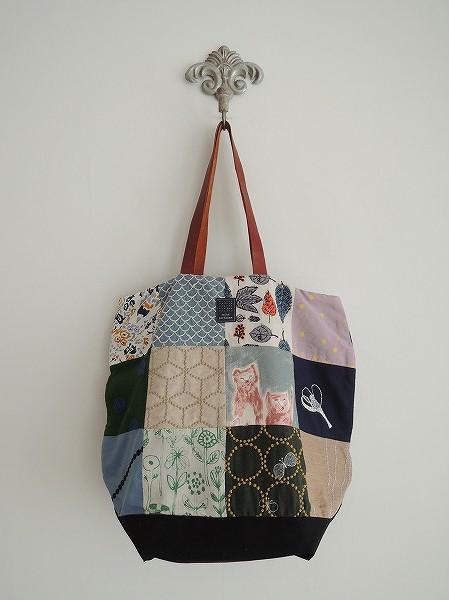 デザイン:mina perhonen 「piece bag」のピースバッグ大です。ホワイト×ブルーのrun run run、くすんだライトブルー×クリ―ムのmermaid、ネイビー×ホワイトのsometimes luckyなど、 様々なテキスタイルが使用された贅沢なデザインです。底部分はブラックのソフトキャンバス地に切替られ、持ち手はブラウンのレザーで、内側はチャコールブラウンの裏地に切替られ、ピンクのちょう刺繍入りのフラップが付いております。内ポケットは2つ付きで、素材は表地が綿・絹・麻・毛、別布が綿100%、裏地が麻100%、持ち手部分が牛革です。