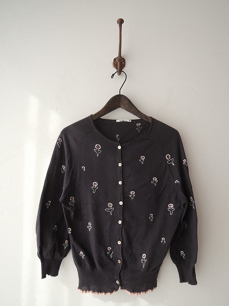 デザイン:mina perhonen 「hana」のニットカーディガンです。カラーは褪せ感のあるネイビーで薄手ニットであしらわれており、ライトピンク・ホワイトの刺繍が施されております。