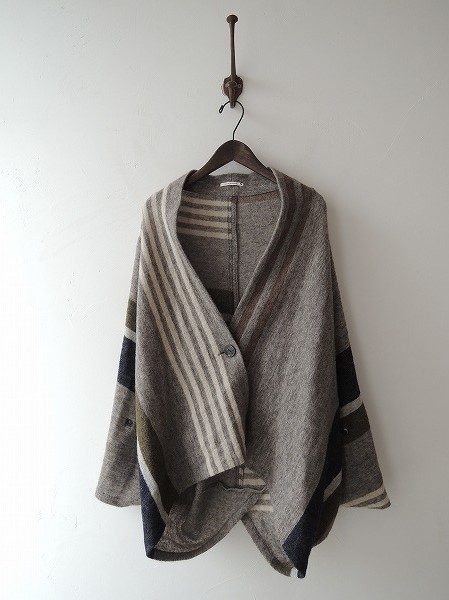 デザイン:mina perhonen 「float」のカーディガンです。カラーはグレーで、ネイビー、アイボリー、カーキグリーンのライン入りです。袖にボタン、紐付きで、ロールアップ可能です。