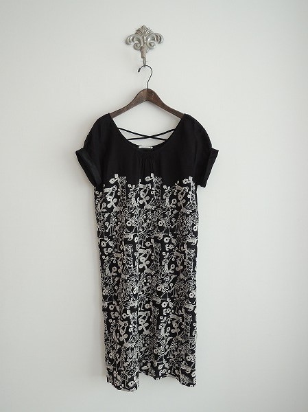デザイン:mina perhonen 「neighborhood」のワンピースです。カラーは黒のガーゼ素材で、全体に白の刺繡があしらわれています。袖口はシルク生地に切り替えられています。裏地付きです。