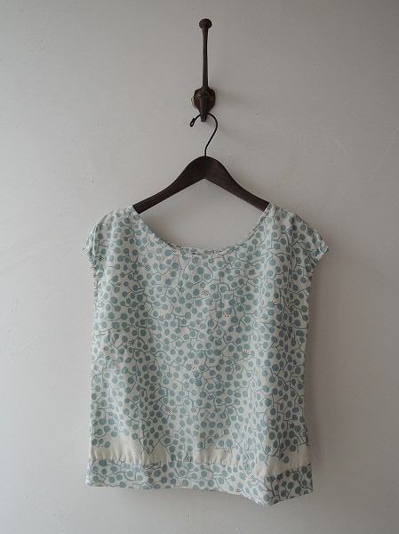 デザイン:mina perhonen 「sprout」の背開きブラウスです。カラーは白ベースに水色、オレンジの総柄で、背中のボタンで着脱できます。袖ぐり上部にゴム入りです。
