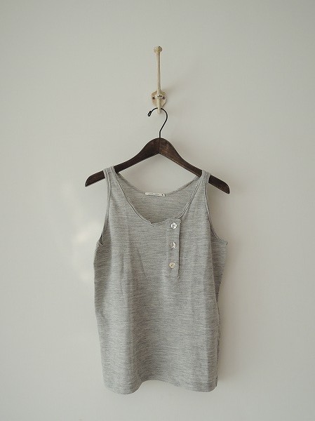 デザイン:mina perhonen 「arena」のニットタンクトップです。カラーはミックスグレーで薄手ニットであしらわれており、襟元には貝ボタンが使用されております。