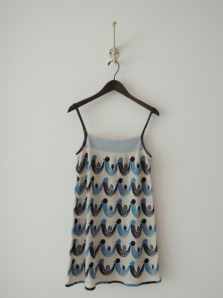 デザイン:mina perhonen 「twitter」のキャミソールチュニックです。少しくすんだ感じのアイボリーのメッシュ状の生地にブラック&ライトブルーの刺繍入りで、胸元はスモッキングが施されております。やや透け感のあるデザインです。
