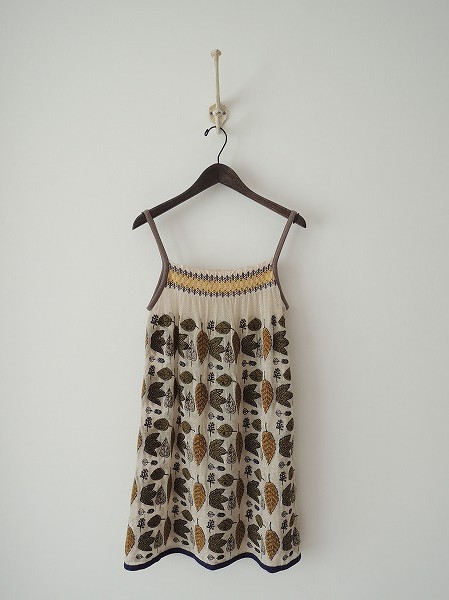 デザイン:mina perhonen 「winter flags」のキャミソールチュニックです。ライトベージュのメッシュ状の生地にネイビー・カーキ・ライトグレーの刺繍入りで、胸元はネイビー・マスタードのスモッキングが施されております。やや透け感のあるデザインです。