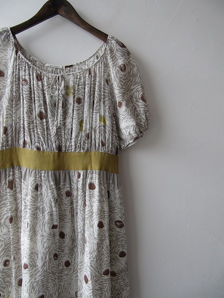 デザイン:mina perhonen「papillon」のワンピースです。カラーは白×ベージュグレーなどの総柄です。薄手素材で、バスト下切り替え部分には黄土色のリボンテープがあしらわれています。左脇下のファスナーは開閉でき、ポケットはなく、スカート部分のみ裏地付きです。