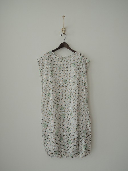 デザイン:mina perhonen 「star fence」のリネンワンピースです。カラーはホワイト地にミントや深緑などの総柄で、少し透け感のある織り生地であしらわれております。裾はゴム入りのバルーンデザインで、付属インナー付きです定価は58、800円です。