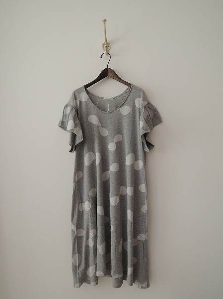 デザイン:mina perhonen 「farfalla」のワンピースです。カラーは杢グレーで、フライス地であしらわれており、シルバーの刺繍が施されております。袖はフレアなバルーンスリーブデザインです。