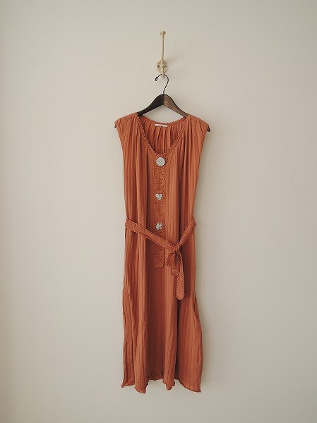 デザイン:mina perhonen 「Annu」のニットワンピースです。カラーは薄茶がかったくすんだピンク系で、ストライプ状薄手ニット地であしらわれております。フロントに飾りボタンが施され、ボタンラインと同様のひもがございます。裏地はなく、定価は46、200円です。