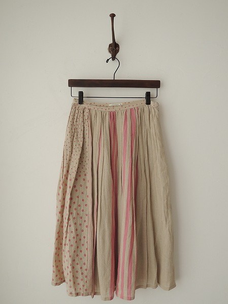 デザイン:mina perhonen 「squall」のフレアスカートです。カラーはサンドベージュで薄手生地であしらわれており、濃グレー&ピンクのプリントが施されております。ウエストはギャザー入りでフレアなシルエットになっており、左サイドのループボタン&ファスナーで着脱できます。