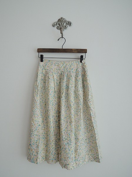 デザイン:mina 「jelly beans」のシルクスカートです。カラーはオフホワイト×水色×レモン×ベビーピンクなどで、薄手の素材です。裏地付きで、ポケットはなく、左サイドのボタン&ジッパーでの着脱です。