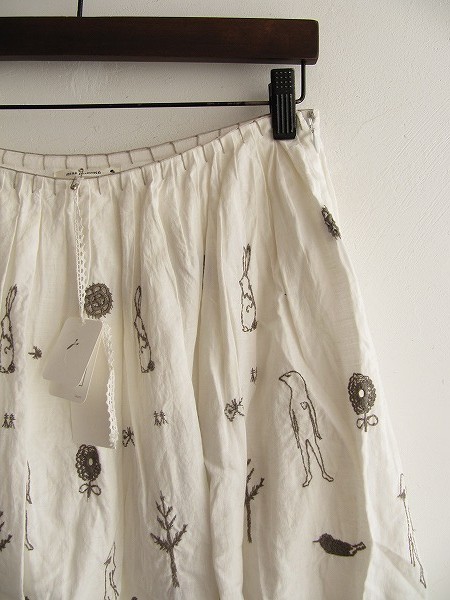 デザイン:mina perhonen 「wander」のリネン刺繍スカートです。カラーはオフホワイトで、薄手生地であしらわれており、グレーの刺繍が施されております。ウエストはプリーツ入りで、左サイドのフック&ファスナーで着脱できます。定価56700円の商品です。