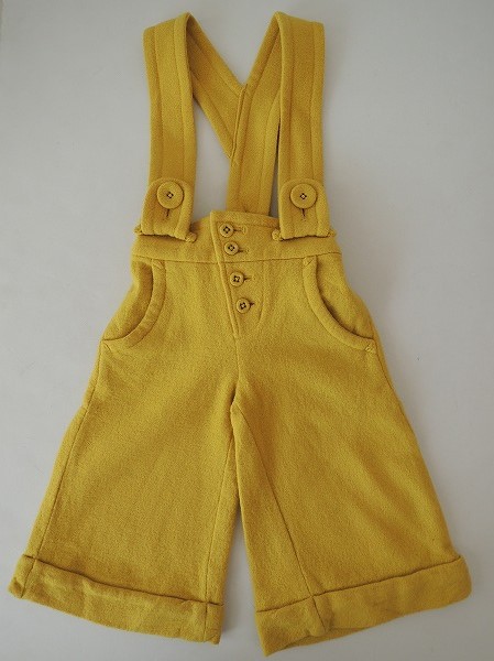 デザイン:mina perhonen 「souffle」のアンゴラ混サロペットパンツです。カラーはイエローで柔らかな手触りの生地であしらわれております。ウエストはアジャスター付きのゴム入りで、フロントボタンで着脱できます。裾はダブルのデザインで、ポケットは4つ付いており、肩ひもは取り外し可能です。子供用アイテムです。