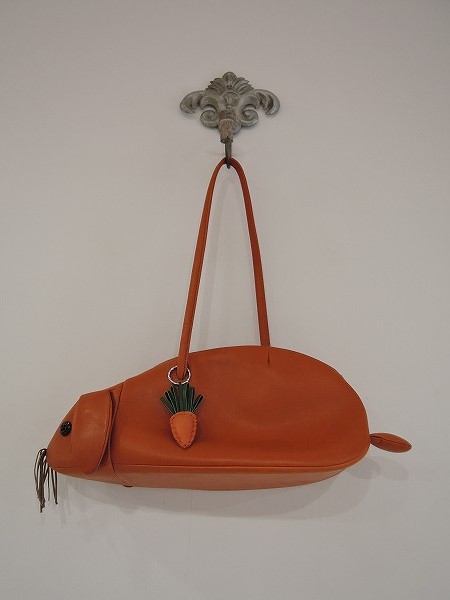 デザイン:mina perhonenのmimiシリーズのレザーうさぎバッグです。カラーはキャメルのレザーで、開口部はファスナーです。内側にはホワイトの蝶々刺繍が施されたブラックの裏地が付いています。にんじんのレザーチャーム付きです。