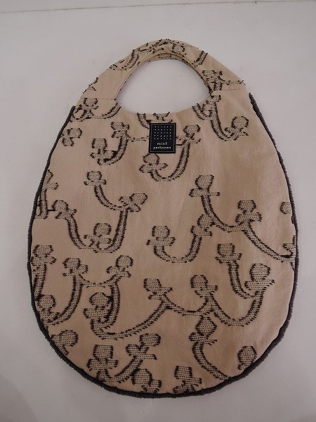 デザイン:mina perhonenのnopparaシリーズのエッグバッグです。カラーはベージュ地にダークグレーのパイル刺繍が施されたデザインで、縁周りにダークグレーの毛足の長いパイピングがあしらわれています。。内側には光沢のあるグレーの裏地が付いており、素材は表地が綿88%、カシミヤ12%、裏地がポリエステル100%です。