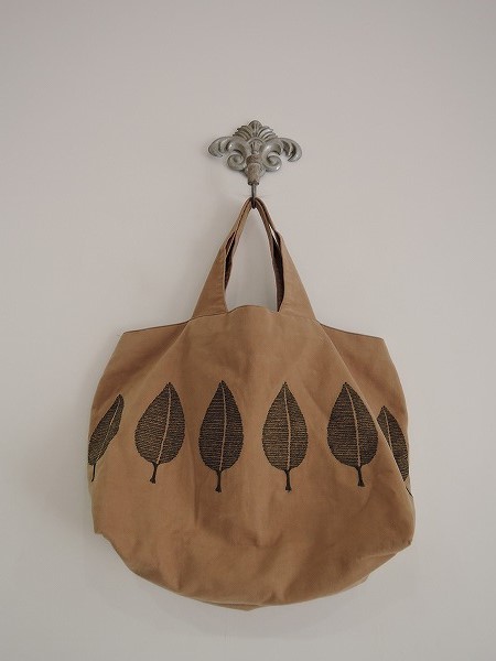 デザイン:mina perhonenのhappaシリーズのパニーニバッグ大です。カラーは濃いベージュ地にダークグリーンで葉っぱの刺繍が施されており、開口部にはベージュで蝶々の刺繍が施されたカーキブラウンの被せが付いています。内側にはポケットが2つ付いており、素材は表生地が綿93%、ポリウレタン7%、刺繍部分が綿100%、裏地が麻100%です。