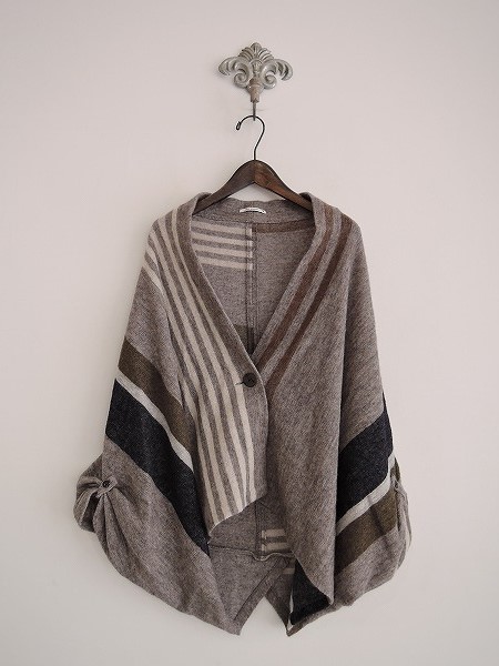 デザイン:mina perhonen 「float」のカーディガンです。カラーはグレーベースにネイビー×グリーンカーキ×ブラウン×オフホワイトのマルチボーダー柄で、柔らかな手触りの薄手ニットであしらわれております。フロントはひとつボタンの開閉で、袖はロールアップができるデザインです。 (掲載写真は、実商品のカラーにできるだけ近づけるよう努力はしておりますが、お使いのモニターや画面設定等によっては、色が異なって見える場合もございますので、予めご了承下さい)