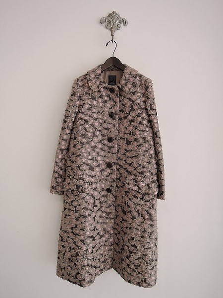 デザイン:mina perhonen 「moss rose」の総柄コートです。カラーはブラウングレー×ブラックの細かな格子織り生地に、グレーベージュの毛足の長いループ素材と光沢のあるピン クの織柄が施されています。ボタン開閉で、両腰&左胸内側にポケットがございます。後ろベルト&裏地付きです。 (掲載写真は、実商品のカラーにできるだけ近づけるよう努力はしておりますが、お使いのモニターや画面設定等によっては、色が異なって見える場合もございますので、予めご了承下さい)