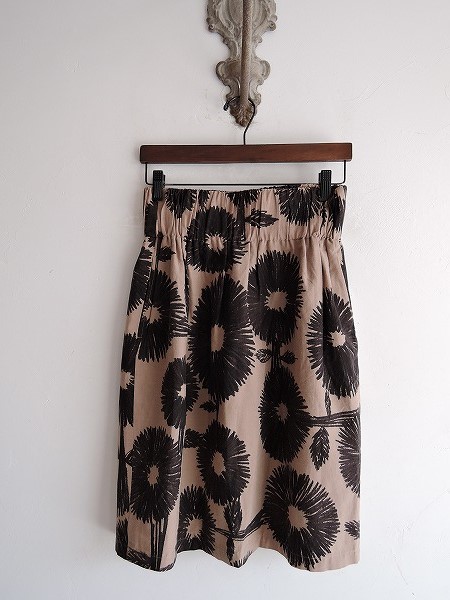 デザイン:mina perhonen 「daisy」の花柄スカートです。カラーはベージュ×ブラウンのお花柄で、ウエストに幅広ゴムが通っております。両腰サイドにシームポケットがあり、裏地がございます。(掲載写真は、実商品のカラーにできるだけ近づけるよう努力はしておりますが、お使いのモニターや画面設定等によっては、色が異なって見える場合もございますので、予めご了承下さい)