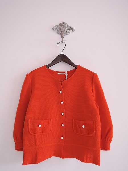 デザイン:mina perhonen 「nostalgia」のジャケットです。カラーはオレンジで、ニット素材であしらわれております。フロントボタン開閉で、両腰にポケットがございます。裏地は無く、定価54,600円の商品です。 (掲載写真は、実商品のカラーにできるだけ近づけるよう努力はしておりますが、お使いのモニターや画面設定等によっては、色が異なって見える場合もございますので、予めご了承下さい)
