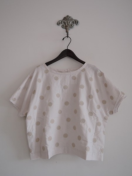 デザイン:ミナペルホネンランドリー 「vapor」のドット柄ブラウスです。カラーはライトベージュにベージュのドット柄刺繍が施されています。バックセンターのボタン開閉です。 (掲載写真は、実商品のカラーにできるだけ近づけるよう努力はしておりますが、お使いのモニターや画面設定等によっては、色が異なって見える場合もございますので、予めご了承下さい)