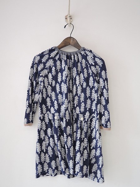 デザイン:mina perhonen 「snow candle」のワンピースです。カラーはネイビーベースにオフホワイト×グレーの総柄で、カットソー地であしらわれています。襟ぐりはグレー・袖口にブラウンのパイピングが施され、どちら共ゴム入りです。両腰に飾りフラップがあり、裏地は付いておりません。子供用アイテムです。 (掲載写真は、実商品のカラーにできるだけ近づけるよう努力はしておりますが、お使いのモニターや画面設定等によっては、色が異なって見える場合もございますので、予めご了承下さい)