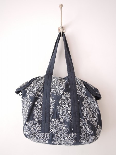 デザイン:mina perhonenのsometimes luckyシリーズのローブバッグです。カラーは褪せ感のある紺地に、ホワイトでクローバーの刺繍とカットワークが全面に施されており、開口部はファスナーで、両サイドをスナップボタンで留めるデザインです。内側には紺の裏地付きで、ポケットが内側と外側に1つずつ施されています。素材は表生地・刺繍部分が綿100%、裏生地が麻100%で、本体価格は28,000円です。