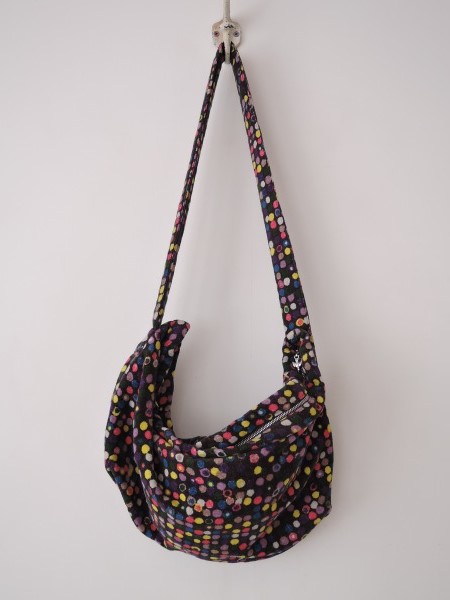 デザイン:mina perhonenのceremonyシリーズのボディバッグ小です。カラーはダークブラウンのパイル地にイエローやピンクなどのカラフルなドット模様の総柄で、開口部は小鳥のモチーフがあしらわれたファスナーです。内側には濃いピンクの裏地とポケットが1つ付いており、素材は表生地が毛94%、麻6%で、裏生地がポリエステル100%です。