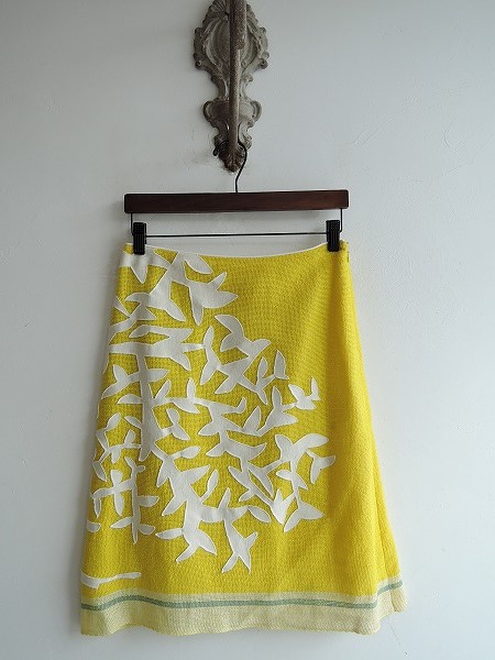 デザイン:mina perhonen「puu」のメッシュニット綿麻スカートです。カラーは鮮やかなイエローのメッシュ地にアイボリーの植物のような模様が施されており、裾はライトイエロー&ライトブルーグリーンのラインが入っています。左腰のフック&ファスナーで着脱でき、裏地付きです。定価44,100円です。 (掲載写真は、実商品のカラーにできるだけ近づけるよう努力はしておりますが、お使いのモニターや画面設定等によっては、色が異なって見える場合もございますので、予めご了承下さい)