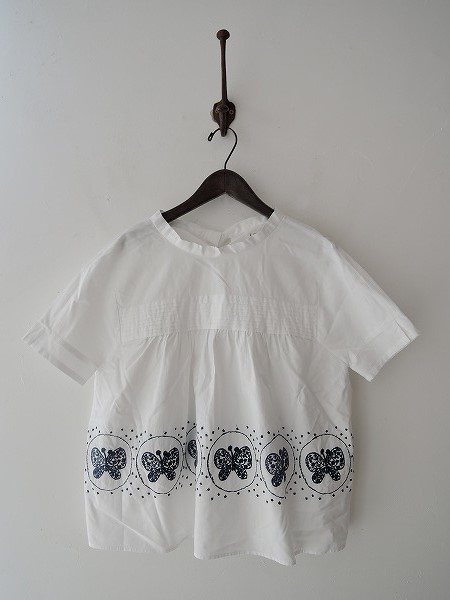 デザイン:ミナペルホネンランドリー 「forest wing」の刺繍シャツです。カラーはホワイトで、ネイビー&グレーがかったネイビーの刺繍が施されております。身頃上部にピンタックが施されており、背上部は共布ひも付きのスリット入りです。(掲載写真は、実商品のカラーにできるだけ近づけるよう努力はしておりますが、お使いのモニターや画面設定等によっては、色が異なって見える場合もございますので、予めご了承下さい)