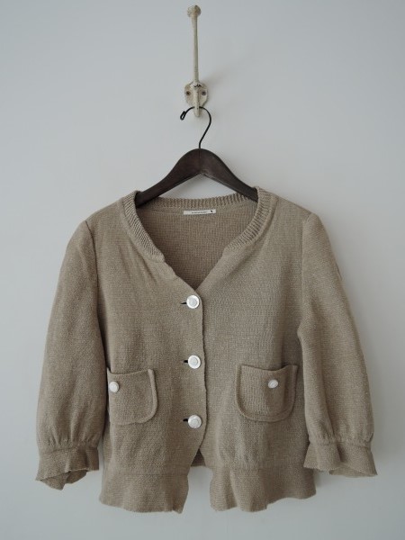 デザイン:mina perhonen 「nostalgia」のニットジャケットです。カラーはベージュで、やや薄手のニット素材であしらわれております。フロントボタン開閉で、両腰にポケットがあり、裏地は付いておりません。 (掲載写真は、実商品のカラーにできるだけ近づけるよう努力はしておりますが、お使いのモニターや画面設定等によっては、色が異なって見える場合もございますので、予めご了承下さい)