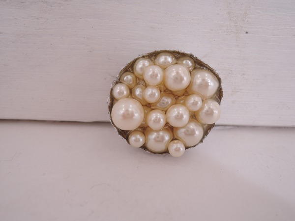 デザイン:mina perhonenのパールブローチです。パールカラーはクリーム系で、大小異なるパールがふんだんにあしらわれております。留め具はピン仕様で、裏側には「dotcity」の文字が施されております。