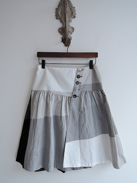 デザイン:mina perhonen 「infinity」のヨークスカートです。カラーは白×黒×様々なグレーで、薄手のツイル素材です。フロントのボタン開きで、打ち合わせに少し段差があり、スリットが20cmほどございます。ポケットはなく、ヨーク部分には裏地がございます。 (掲載写真は、実商品のカラーにできるだけ近づけるよう努力はしておりますが、お使いのモニターや画面設定等によっては、色が異なって見える場合もございますので、予めご了承下さい)