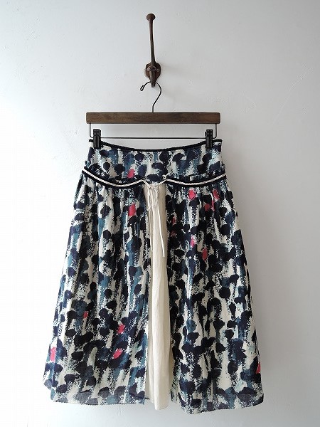 デザイン:mina perhonen 「fog」のカシミヤ混総柄スカートです。カラーはライトベージュ無地に、ネイビー・ブルーグリーン・濃いピンクなどの柄生地が重ねられた、薄手ガーゼ素材であしらわれております。フロントは柄生地がボタン&リボンで留められており、左サイドのフック&ファスナーで着脱できます。裏地付きで、布端はピコカット仕上げです。 (掲載写真は、実商品のカラーにできるだけ近づけるよう努力はしておりますが、お使いのモニターや画面設定等によっては、色が異なって見える場合もございますので、予めご了承下さい)
