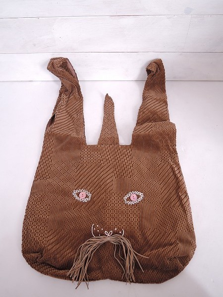 デザイン:mina perhonenのusa bagシリーズのうさバッグ 大です。カラーはブラウンで、柄織りのコーデュロイのような素材であしらわれており、ピンクベージュの刺繍・ブラウンのスエード調フリンジ・ピンクのシェルボタンで、うさぎさんのお顔が施されています。持ち手はお耳の様にあしらわれており、内ポケットが1つ付いております。素材はコットン100%です。