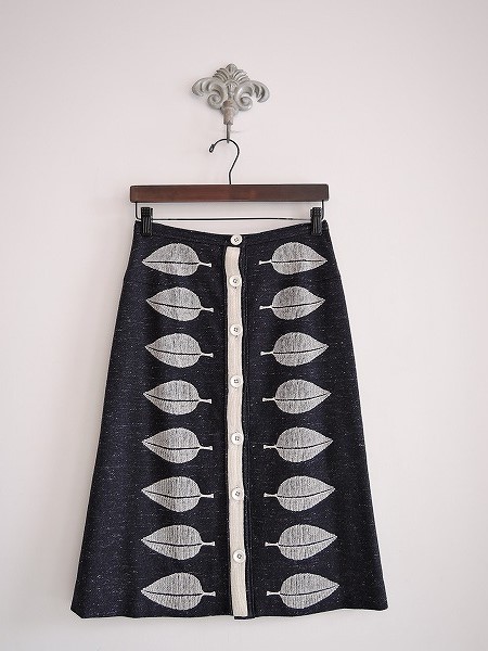 デザイン:mina perhonen 「happa」のシルク混刺繍スカートです。カラーはミックスネイビー・オフホワイトで、リーフ柄の刺繍が入った微起毛素材であしらわれております。フロントボタンで着脱でき、裏地付きです。 (掲載写真は、実商品のカラーにできるだけ近づけるよう努力はしておりますが、お使いのモニターや画面設定等によっては、色が異なって見える場合もございますので、予めご了承下さい)