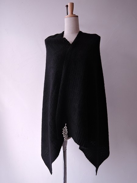デザイン:mina perhonenのfleecyシリーズのストールです。カラーはブラックで、透け感のある柄編みで施されており、サイドにオフホワイトの刺繍モチーフがあしらわれています。素材はカシミヤ80%、毛(セーブル)20%で、本体価格は44,500円です。