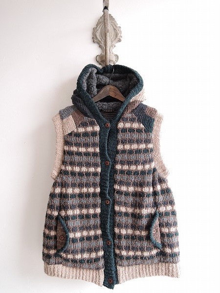 デザイン:mina perhonen 「candy block」のニットベストです。カラーはブラウン×ダークグリーン×ベージュ×グレー系で、ダウン入りのループニット素材であしらわれております。フロントボタン開閉で、両腰にポケットがあり、フードの内側はボア素材です。 (掲載写真は、実商品のカラーにできるだけ近づけるよう努力はしておりますが、お使いのモニターや画面設定等によっては、色が異なって見える場合もございますので、予めご了承下さい)